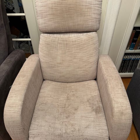 Erittäin hyvä ja jämäkkä tuoli. Oli sähkökäyttöinen (virtajohto) recliner, mutta siivotessani tätä myyntiin onnistuin varmaan irrottamaan jotain johtoa ja mekanismi ei ainakaan nyt toimi. Ei ollut pyörivä malli, vain kallistettava. Saattaa olla kätevämmissä käsissä korjattavissa. Myynti jäi ja vein tämän kerhohuoneelle pölyttymään, mutta josko menisi ilmaiseksi? Painava on eli itse en jaksa nostaa tätä, vaatii autossakin tilaa. Tosi hyvä istua tällaisenaankin, isovanhemmat kaipailleet vieläkin, mutta tilan puutteessa luovuttuva.