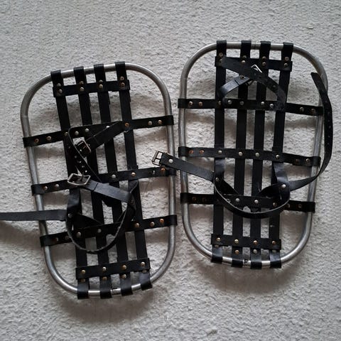 Outbound lumikengät mustassa ja sinisessä värissä, säädettävä koko, mukana sauvat ja kantokassi. Lumikengät on suunniteltu talvikäyttöön lumisissa olosuhteissa ja ne tarjoavat hyvän pidon ja tuen lumella liikkumiseen.