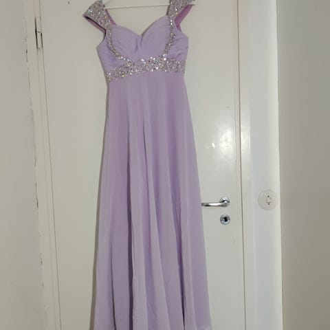 Ompelijalla teetetty "vanhanajan" tanssiaismekko, jossa runsaat hihat ja ruusukkein koristeltu helma. Myös vyötäröllä koristeet edessä ja takana. Siistikuntoinen, mutta hyötyisi pesulatason silityksestä, niin rusetit jne. saisi taas ryhdikkäiksi. Mekkoon kuuluu runsas tyllihame, joka nostaa helman tosi upeasti liikkeeseen.