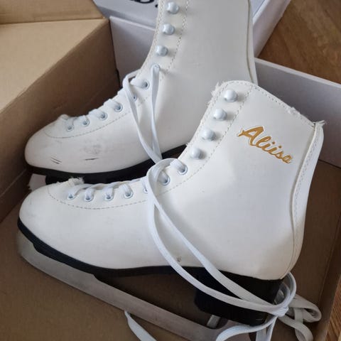 Tekoturkisvuorella olevat Aliisa luistimet. Vain muutamia kertoja käytetyt, mutta pinnan ulkoreunaan tullut kuitenkin reikä. Koko 41, sisäpituus 26,5 cm.
