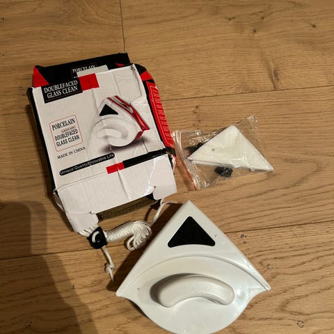 Käyttämätön ikkunapesuri sekä mukaan avaanaron pesuaine pullo.