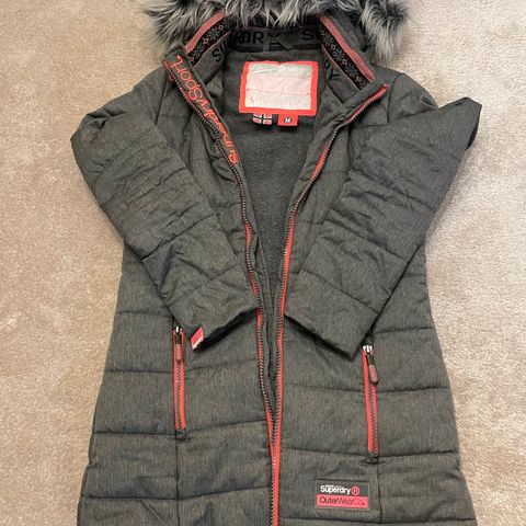 Hyväkuntoinen Superdryn takki. Vuori yläosassa teddykarvaa, muuten satiinia. Vetskaritaskut ja kiristysnyöri vyötäröllä.