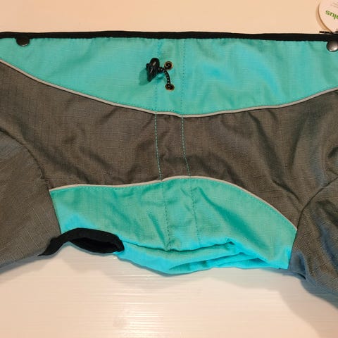 Zooplus koiran haalari harmaalla ja turkoosilla värillä. Takissa on säädettävä kiristysnyöri selkäosassa ja kaulalla. Fleece vuori