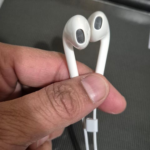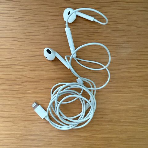 Apple EarPods Lightning Connector -kuulokkeet, joissa on Lightning-liitin. Kuulokkeet ovat valkoiset ja suunniteltu käytettäväksi laitteiden kanssa, joissa on Lightning-portti.