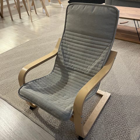 Ikeasta ostettu lasten nojatuoli harmaalla kankaalla.