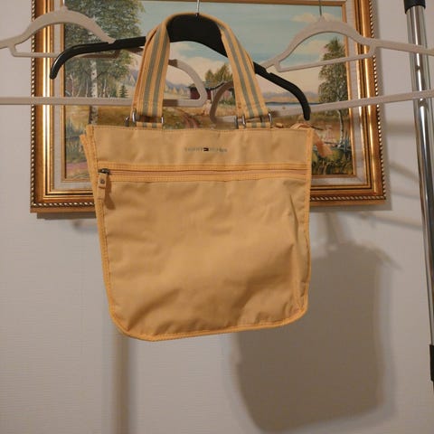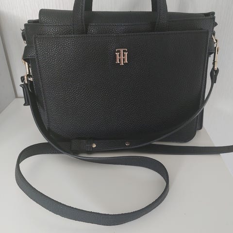 Tommy Hilfiger kangaslaukku naisille, ruskea väri. Laukussa on kaksinkertaiset kantokahvat ja säädettävä olkahihna. Vetoketju ja koristeelliset metalliosat. Laukku sopii arkeen ja vapaa-aikaan.