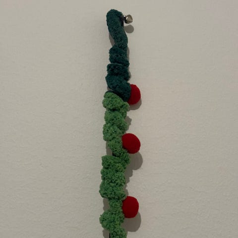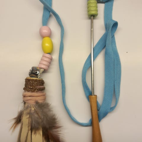 Käsintehty kissan lelu, jossa on värikäs pitkä nauha, nahkatupsu, helmet, helin ja höyhenkoriste.