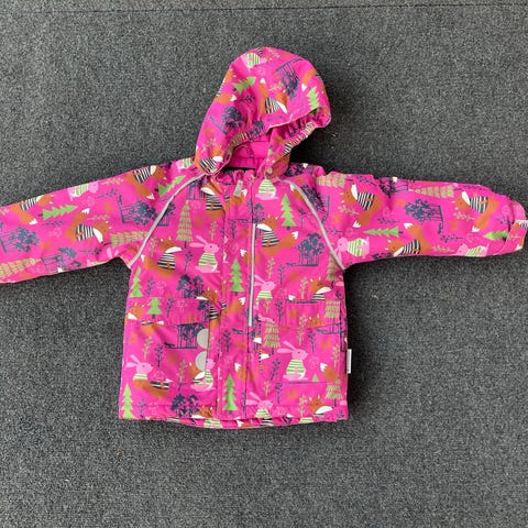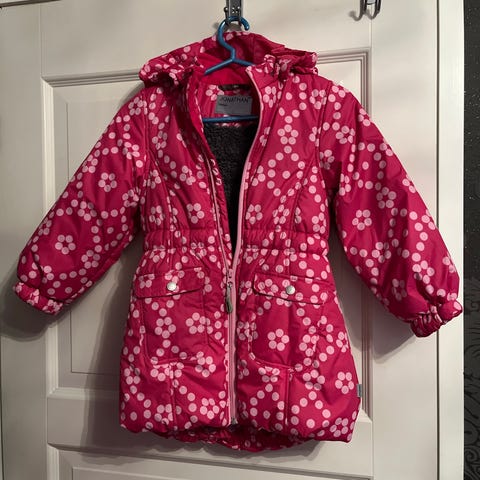Lämmin Jonathan toppatakki koossa 104, väriltään pinkki. Kuvioinnissa karhuja talvimaisemassa. Valmistettu polyesteristä.