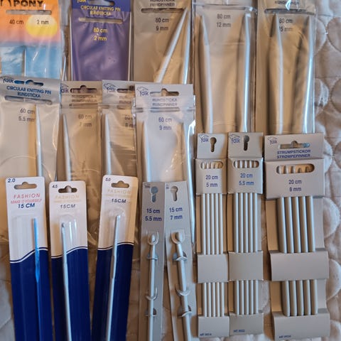 Muoviset pyöröpuikot, sukkapuikot ja virkkuukoukut sekä avaimenperä virkkuukoukut (metallia).