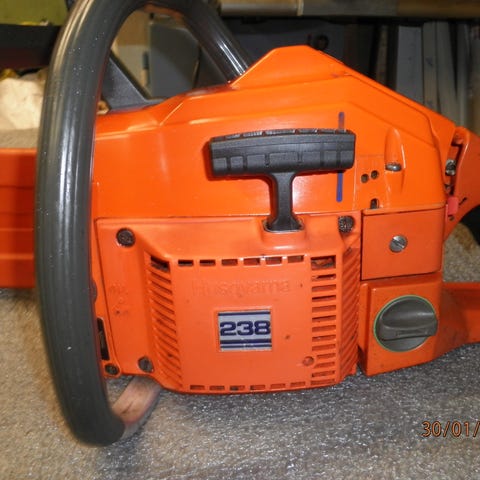 Husqvarna 346XP moottorisaha oranssilla rungolla. Työkalu soveltuu puun sahaamiseen ja metsätöihin.