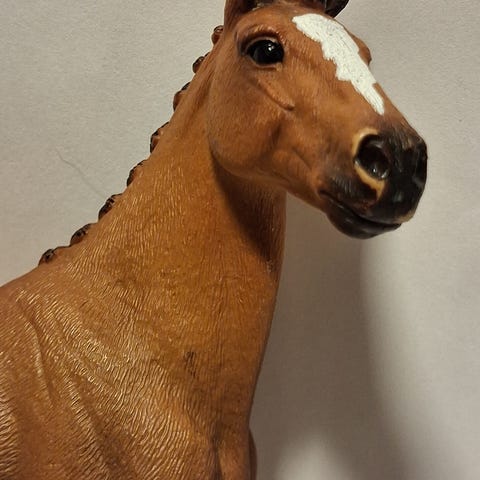 Schleich vanhempi pinto ruuna. Vuosiluku 1998, harvinainen, ei enää valmisteta. Maalipinnassa paikoin selvemmin kulumaa ja pientä jälkeä. Toisen korvan kärki katkennut.