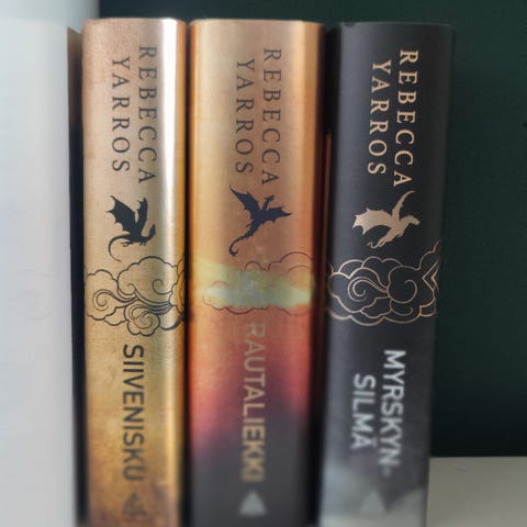 Rebecca Yarros: Siivenisku, Rautaliekki ja Myrskynsilmä Empyrean sarjasta. Kovakantiset, uudet.