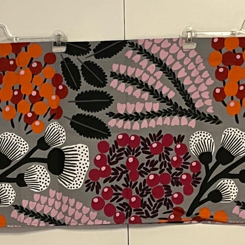 Ei antanut tuotemerkiksi laittaa "Pentik", mutta on Pentikiltä ostettu kangas. Ommeltu pentikin kankaasta. Tarkkoja mittoja en nyt saa, mutta on se ainakin 3metriä leveä.