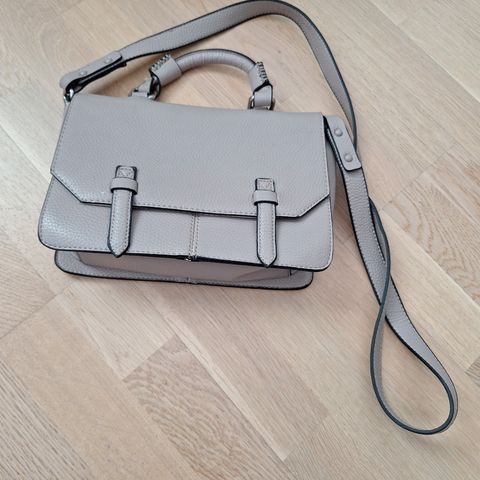 Keinonahkainen olkalaukku farkunsinisenä/siniharmaana. Laukussa on metallinen lukko ja ketjuhihna (ei säädettävä), sisätiloissa vetoketjutasku ja toinen tasku. Hihnan pituus 140cm. Lev 23cm, korkeus 15cm, paksuus 6cm.