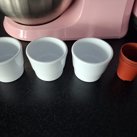 Valkoiset halk n7cm, korkeus 6cm suojaruukut. Pohjissa ei ole reikiä. Mukaan kuuluu myös muoviset istutusruukut. Hae Pateniemestä kaikki pois 5 eurolla.