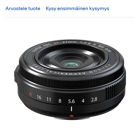 Lähes käyttämätön Fujifilm Fujinon Super EBC XF 27mm f/2.8 objektiivi, kiinteä polttoväli 27 mm, suurin aukko f/2.8. Alkuperäiset 2 etutulppaa, vastavalosuoja ja takatulppa ovat kuten kuvissa. Mukaan saa oman löytöni Soligorin tulpan, jolla kompaktin linssin saa vielä kompaktimmaksi x100 tyyliin. Samoihin aikoihin tuli ostettua x100vi, joten tämä linssi jäi tarpeettomaksi. Jos sinulla on ylimääräinen 56mm f/1.2 tai 90mm f/2 voidaan sovitella vaihtoa.