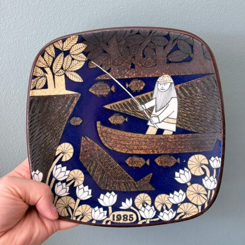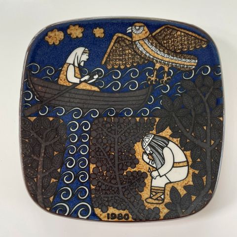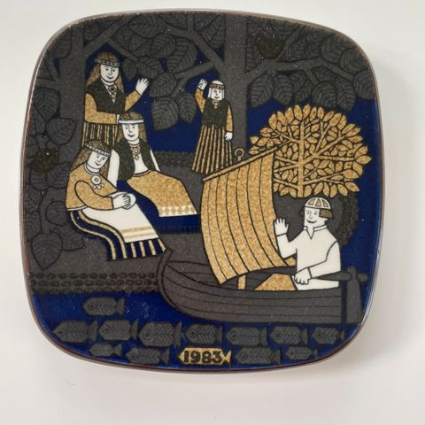 Arabia vuosilautanen vuodelta 1986 valmistettu keramiikasta. Lautasessa on koristeellinen kuva, jossa on henkilö ja luonnon elementtejä tummansinisellä, ruskealla ja valkoisella värityksellä.