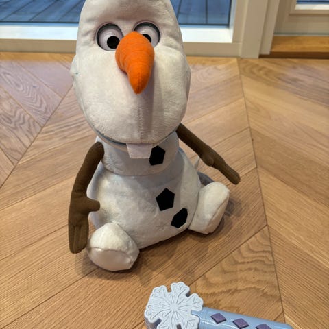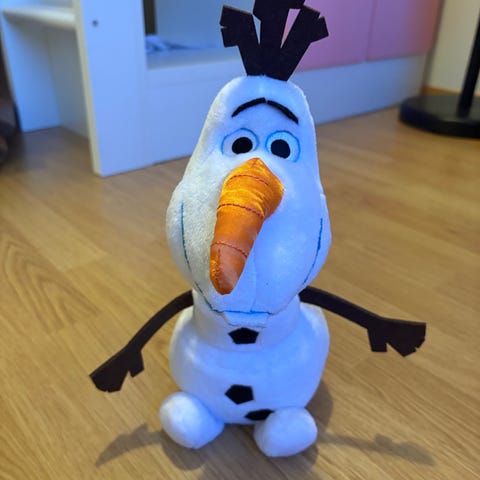 Disney Olaf pehmolelu, valkoinen lumiukkohahmo, pehmeä materiaali.