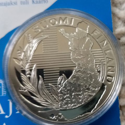 Kokoelma suomalaisia juhlarahoja eri vuosilta ja eri kokoisina. Rahat ovat hopean ja muiden metallien sekoituksia. Kaikki kerralla, tarjoa