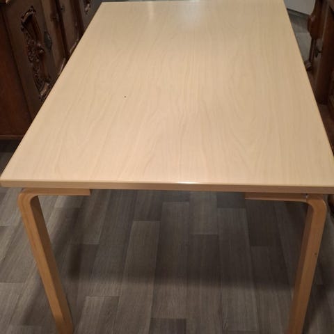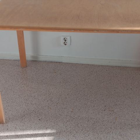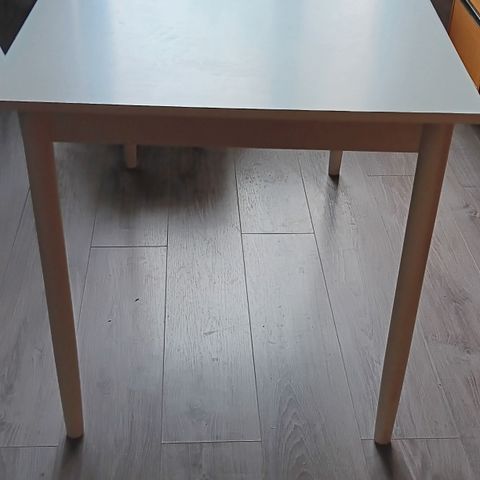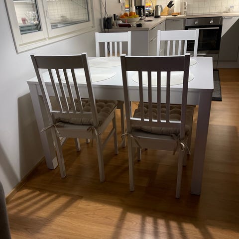 Ruokapöytä 4hlö, jossa valkoinen taso ja puiset jalat. Pöydän kansi on suorakulmainen ja sen alla on ristikkäinen tukirakenne. Ostettu M-kalustosta. Hyväkuntoinen, pientä käytönjälkeä mutta muuten siisti.