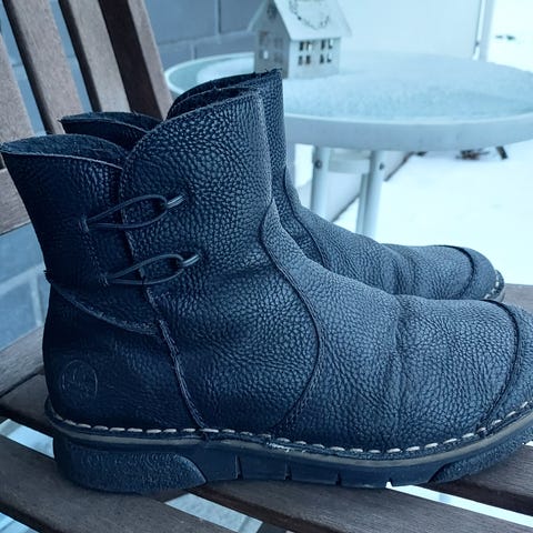 Siistikuntoiset Rieker talvinilkkurit. Vetoketjut sisäsivuilla. Keinonahkaa. Taittumakohdat/pintahalkeamat pinnassa ulkosyrjillä, ympyröity vihreällä. Ei reikää kohdissa ainakaan vielä. Vika huomioitu hinnassa.