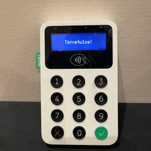 Zettle Reader 2 maksupääte valkoisena, sisältää laitteen, USB-latauskaapelin ja alkuperäisen laatikon. Laite soveltuu maksujen vastaanottamiseen kortilla ja mobiililaitteilla.