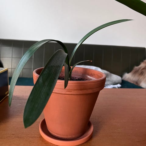 Iso, yksivartinen oranssina kukkiva kliivia saviruukussa. Pari lehteä hieman ruskeana kuten kuvasta näkee. Ei kuki tällä hetkellä, kuva kukinnasta on otettu kun viimeksi kukki.