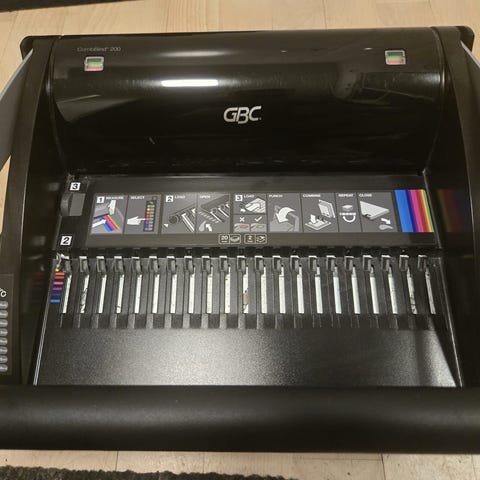 Myydään käsikäyttöinen sidontalaite. Mukana muovisia sidontakampoja sekä kansilehtiä.