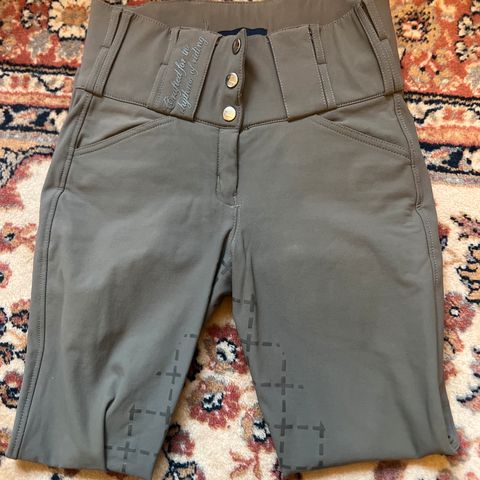 Horze puku kokoa 38/40. Kunto ihan ok, mutta tosi paljon koirankarvaa. Housujen sivuissa vetoketjut ylös asti. Heijastin nauhat hihoissa ja lahkeissa.