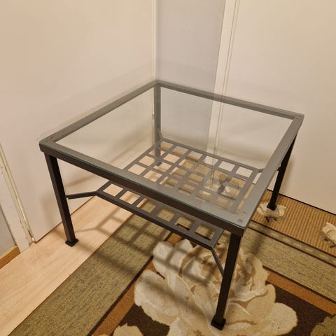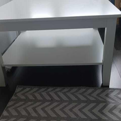 Annetaan Ikean LACK sohvapöytä. Pinta hieman kulunut päältä ja lähtenyt kokonaan yhdestä jalasta. Muuten hyvässä kunnossa. Kulumankin saa piiloon esim pöytäliinalla tai asettamalla seinää vasten.