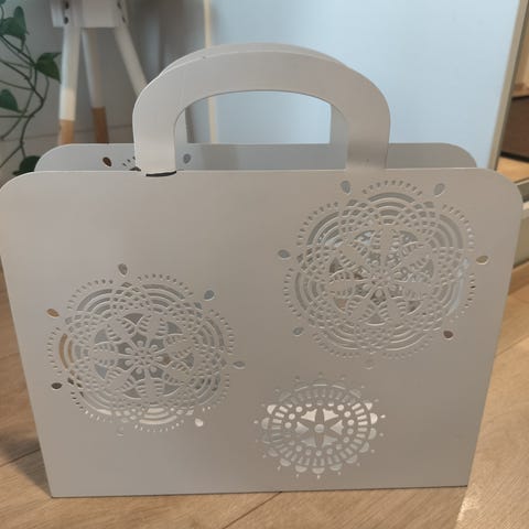 Punottu lehtiteline jossa metallinen rakenne. Punos rikki muutamasta kohdasta. Mitat noin 40 x 36 x 24.