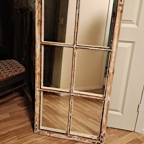 Valkoinen, 3-ruutuinen ikkunapeili. Korkeus 90cm ja leveys 40cm.