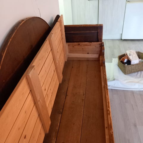 Myydään hieno korkeaselkäinen puusohva täyttä tammea. Istuinosan alla säilytystilaa.