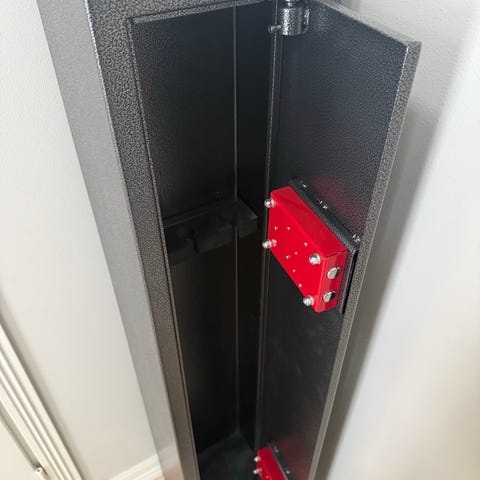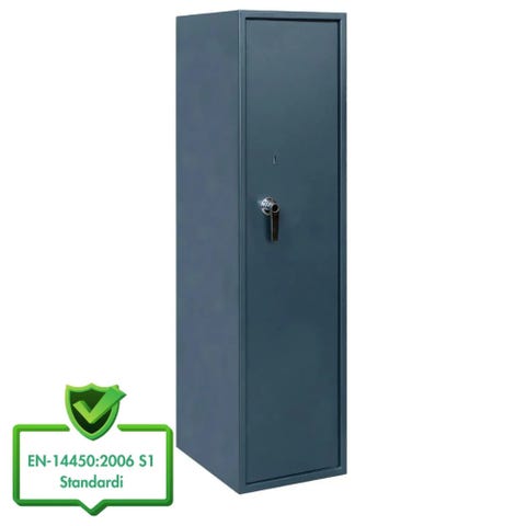 Siistikuntoinen OTSO asekaappi viidelle aseelle. Säilytystilaa myös tarvikkeille ja patruunoille. Mitat kork. 138cm leveys 35cm ja syvyys 27cm.