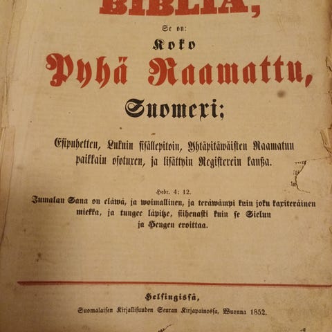 Uusi testamentti 1852 .Kunto on heikko. Kaikki sivut tallessa ja ovat siistejä. Kova kansi puuttuu. Isompi koko 26×19×3