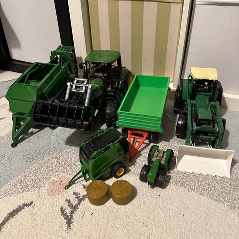 Viljasäiliön pystyy tyhjentämää tyhjennysputkella. Sisältää pieniä muovisia palloja. Lelussa paljon todenmukaisia yksityiskohtia. Avautuvat ovet monia avattavia luukkuja irrotettava niittokone yms..