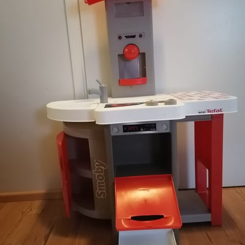 Suositusikä alkaen 3 v. Muovia. Korkeus 96 cm, työtason korkeus 48,5 cm, sopii hyvin 3-vuotiaille ja sitä vanhemmille lapsille. Keittiössä on mm. 1 liesi ääniefekteillä (keittoäänet), pesuallas, uuni, jääkaappi sekä muita osia ja tarvikkeita. Pakattu kuljetuslaatikkoon.