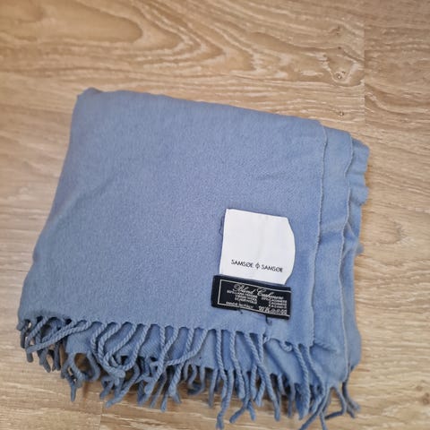 Keltainen Samsøe Ø Samsøe kaulahuivi, pituus hapsuineen noin 220 cm, leveys 55 cm, 80% villaa ja 20% kashmirvillaa. Pari kertaa sovitettu, muuten käyttämätön.