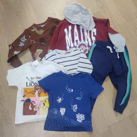 Vaatepaketti pojalle 90-98 cm. Hyvässä käytetyssä kunnossa, ei reikiä tai tahroja. Jos jotain vikaa on, on se mainittu alla. Pientä pesunukkaa saattaa löytyä.