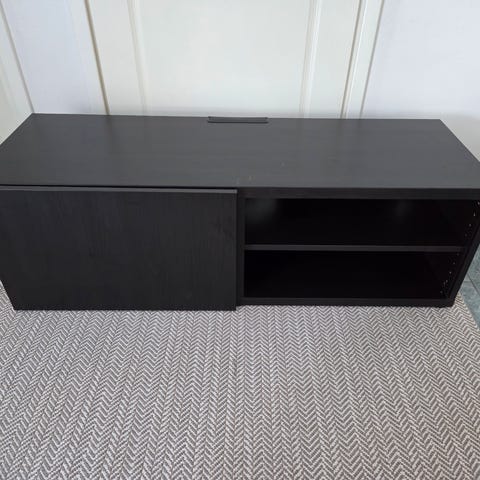 Hyväkuntoinen tv-taso. Takalevyyn tehty reikiä ilmanvaihdon parantamiseksi.