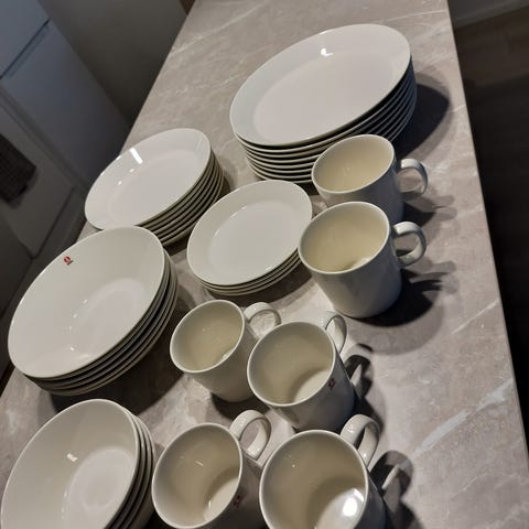 Iittala teema astiasto. Sisältää 6kpl lautasia, 6kpl syviä lautasia, 6kpl jälkiruoka kulhoja, 6 kpl pieniä lautasia, 6kpl mukeja. Astiaston materiaali on keraaminen, ja se soveltuu päivittäiseen käyttöön keittiössä ja ruokailussa.