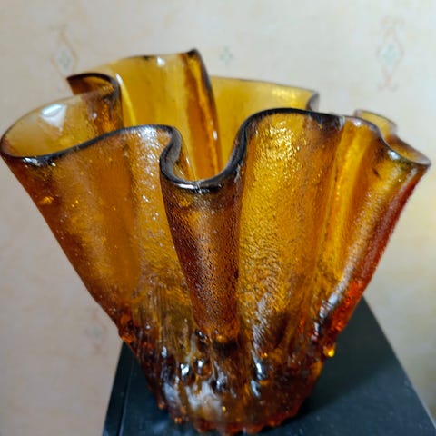 Karhulan lasitehtaan maljakko, ruskea. Pieni särö reunassa( ei hopeapantaa tallessa).Painava, paksua lasia. Korkeus 12;cm, leveys ylhäältä 9 cm . Postikulut ostajalle.