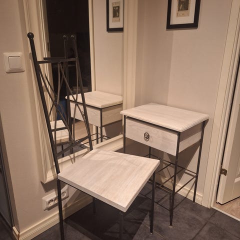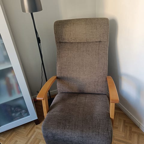 Lahden puutyön Hannu Peltosen suunnittelema Trio-raita nojatuoli ja sohvapöytä pyörillä