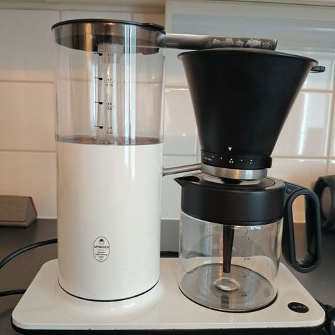 Wilfa kahvinkeitin valkoisella värillä. Laite sisältää vedenkeittimen ja suodattimen kahvin valmistukseen.