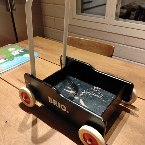 Elämää nähnyt, mutta ehjä taaperokärry seuraavalle. Jonkin verran naarmuja. Renkaat ym. ehjät.