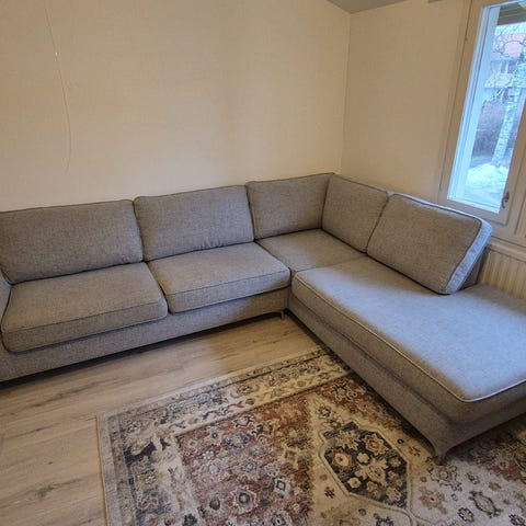 Myydään 2019 loppuvuonna ostettu, 2020 vuoden alussa käyttöön otettu Fanni kulamsohva. Ostettu Askosta. Väri vaalean harmaa. Sohvaa pystyt putsaamaan kostealla pyyhkeellä, ostettaessa laitettu suoja-aineet ja kertaalleen toisen kerran. Kätisyys vasen. Muutama tahra, kuvissa, ei ole kokeiltu putsat millään aineella. Kangas ehjä. Sohva menee kahteen osaan, jalat saa ruuvattua irti. Jalat mustat. Vuoden verran ollut aikalailla sivussa, ei jokapäiväisessä käytössä.
