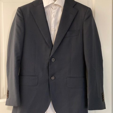 Japanilaisen Suit Selectin ohut musta puku raidoilla.