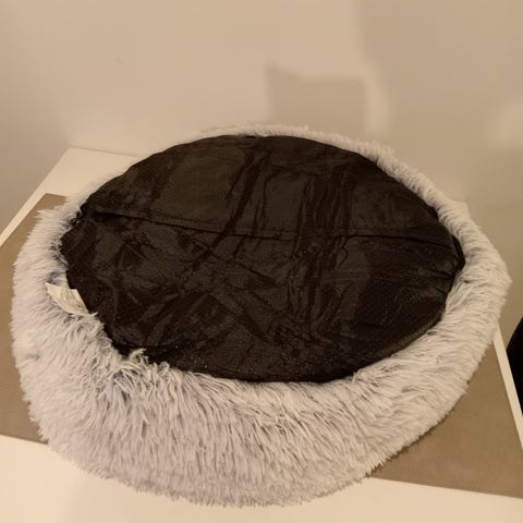 Koiran pörröpeti / sohvasuoja. Alustassa ei ole täytettä alla vaan tarkoitettu käytettäväksi esim sohvalla. Itse alustan koko 50x55, siihen päälle reunus jossa putkityyny. Putkityyny saa pesun ajaksi pois, vetoketju. Väri oikeasti minusta hieman vaaleampi kuin kuvassa. Tumma harmaa kuitenki.