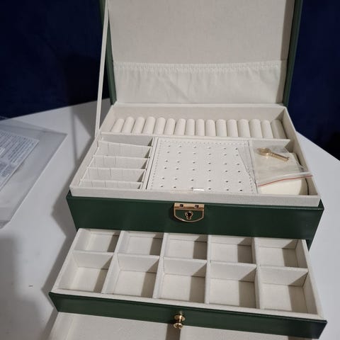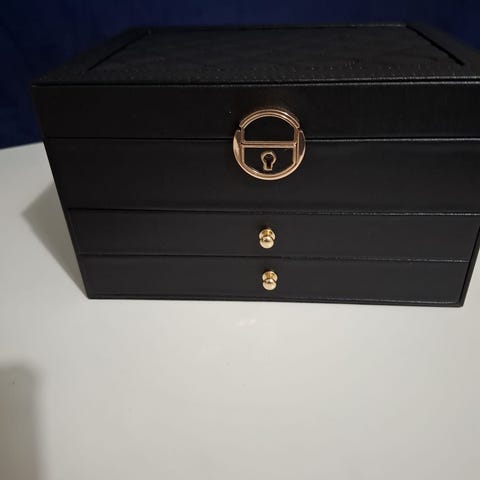 Ihastuttava silkkikankaalla päällystetty korujen tai meikkien säilytykseen soveltuva rasia. Nepparikiinnitys ja kantokahva. Soittorasia ei toimi. Koko noin 24x35cm.