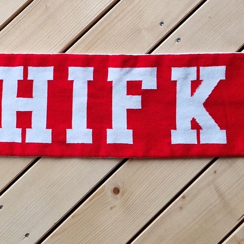HIFK fanihuivi, värit punainen ja musta. Huivissa on HIFK:n logo ja vuosiluku 1897. Materiaali ei tiedossa.